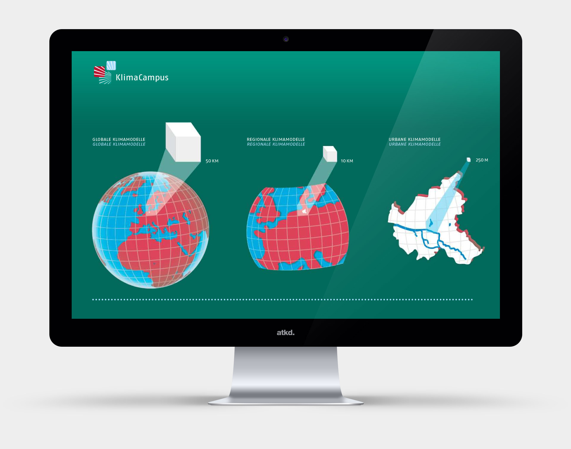 Full-HD Touchscreen-Oberfläche mit einem Hybrid aus Realbild und kartographischer 3D-Landschaft zum Forschungsgebiet Stadtklima. Der Klimawandel ist ein weltweites Problem, das aber in Ländern und Regionen unterschiedlich in Erscheinung treten wird. In Städten wirkt er mit Bebauung, Vegetation, Industrie und Verkehr zusammen. Diese Faktoren können die Risiken verstärken, aber auch verringern. Projektrealisation mit Goldfuchs Studio Hamburg und Saubere Filme Hamburg.